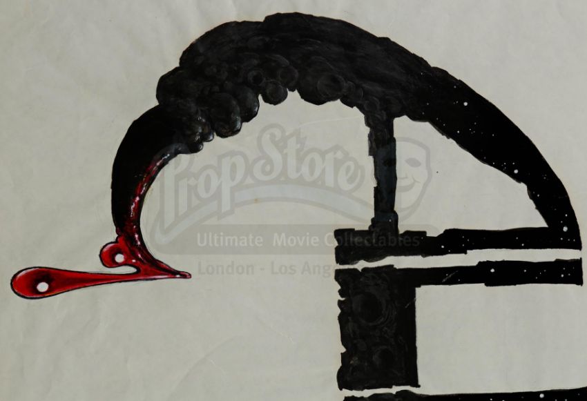 This hand-drawn concept art designed by the film's concept artist Ron Cobb as a possible logo or title for the opening credits sequence features the word "Alien" with a bloodied xenomorph tail. It is rendered in ink and graphite on oversize drawing paper. The drawing exhibits pinholes in the corners, as well as some staining and creasing from use. Dimensions: 48.5 cm x 61 cm (19" x 24")
