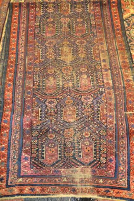 Hamadan runner with a repeating Boteh design on blue ground with borders (worn), 303cms x 89cms