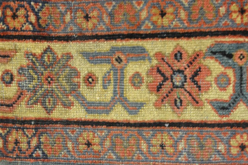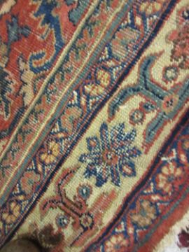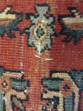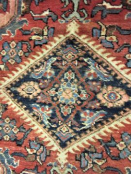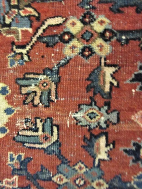 Mahal carpet with a medallion and all-over stylised floral design on a red ground with borders (slight areas of wear), 311cms x 221cmsWear all over, some stitched repairs, also missing tasselled edges