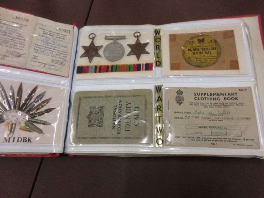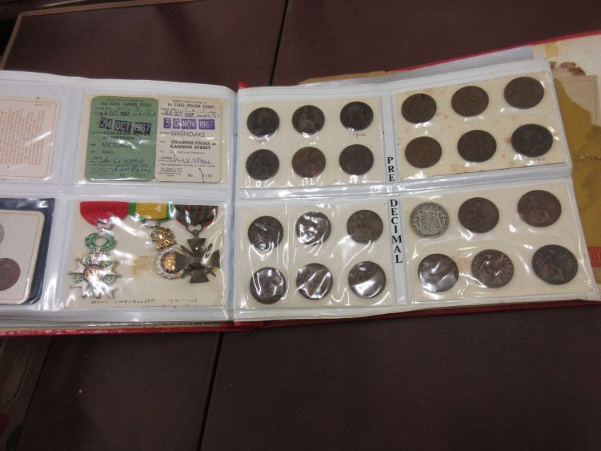 Album containing a quantity of World War I and II memorabilia and ephemera including medals, together with a small quantity of coins etc