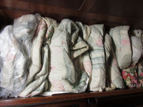 Quantity of various Water Bird and Lily Pad pattern pale green quilted curtains of various widthsThese curtains are made of cotton, they are lined, interlined pleated heading, quilted to pattern lily, pads, storks, ducks. Very dirty but ok condition, cannot see any moth or other damage4 @ 2 widths wide x 8ft long4 @ 1 width wide2 @ 1.5 widths wide3 pelmets, fringed x 14ins deep