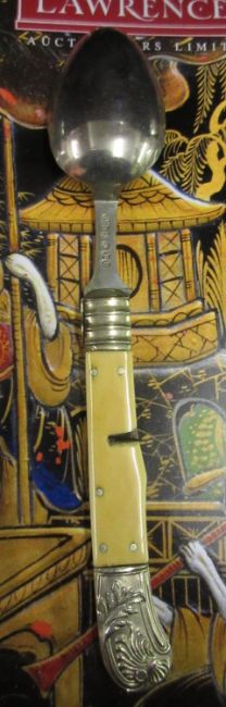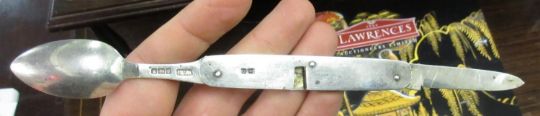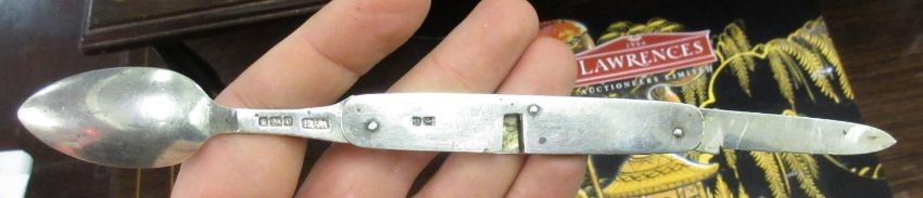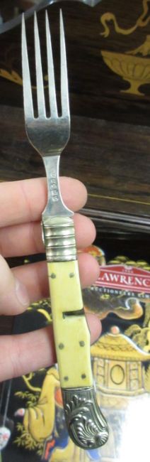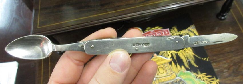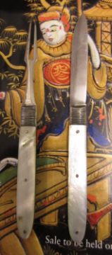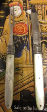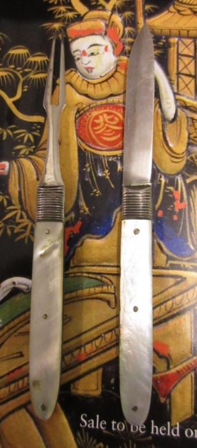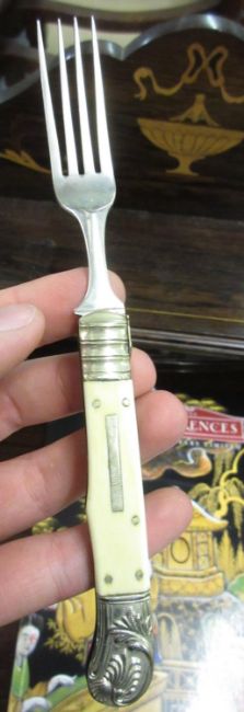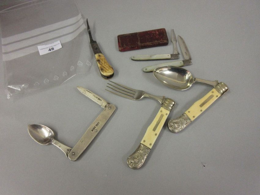 Georgian silver and mother of pearl handled campaign knife and fork in original case, a 19th Century campaign spoon and fork, similar 18th Century steel and bone fork, an early 20th Century silver campaign knife and spoonCondition report