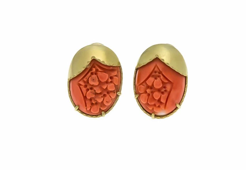 Coral ear clips GG 585/000 with 2 finely carved coral elements, flower representation, L.