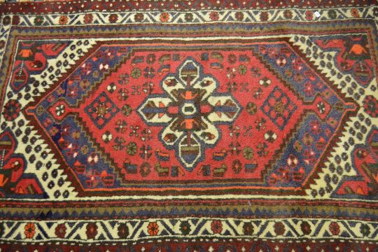 Small Hamadan rug with single gol on a wine red and blue ground with multiple borders, 4ft x 3ft approximately
