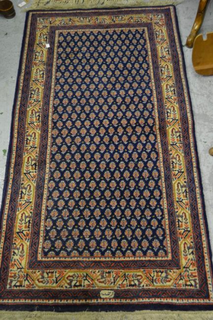 Persian style rug of all-over Boteh design with multiple borders on blue ground with signature to the border, 54ins x 29ins