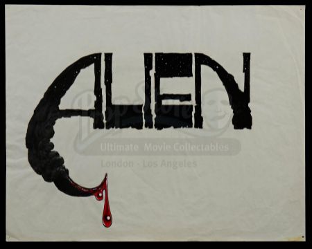 This hand-drawn concept art designed by the film's concept artist Ron Cobb as a possible logo or title for the opening credits sequence features the word "Alien" with a bloodied xenomorph tail. It is rendered in ink and graphite on oversize drawing paper. The drawing exhibits pinholes in the corners, as well as some staining and creasing from use. Dimensions: 48.5 cm x 61 cm (19" x 24")
