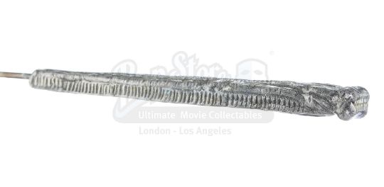 This piece, designed by Academy Award-winning special effects group Amalgamated Dynamics, Inc. (ADI), is made of resin moulded around a long steel pipe. It is hand-painted silver and black, and lacquered to appear slimy. The tongue was designed to actually puncture objects during SFX inserts, and its ornate ridged details and biomechanical design hark back to H.R. Giger's original creature designs for Ridley Scott's Alien. The tongue features two pieces of tape from production still wrapped around the pipe. Dimensions: 5 cm x 5 cm x 184.5 cm (2" x 2" x 72 1/2")
