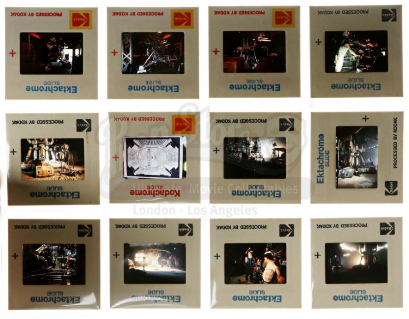 This three-ring binder includes 12 plastic storage sheets containing 222 35mm behind-the-scenes film slides photographed during production by the film's concept artist, Ron Cobb. The photographs were primarily shot at Shepperton Studios during production, and the vast majority of the content is unpublished. A digital copy of scans of each slide is also included. This archive comes with Cobb's original Kodak slide trays in boxes labelled for the film. Dimensions: 33 cm 31.75 cm x 31.75 cm (13" x 12 1/2" x 12 1/2")
