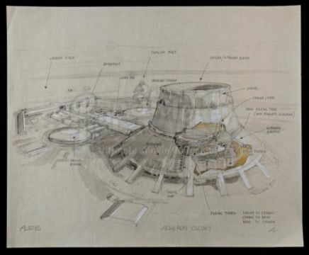 This hand-drawn concept sketch depicts an exterior view of the Hadley's Hope colony on LV-426, and is the work of the film's conceptual designer, Ron Cobb. It is rendered in mixed media on self-adhesive drawing paper labelled "ALIENS ACHERON COLONY AP" and signed "RCOBB '85". There is minor wear along the edges from handling, and the sketch is presented loose. Dimensions: 35.75 cm x 43.25 cm (14" x 17")