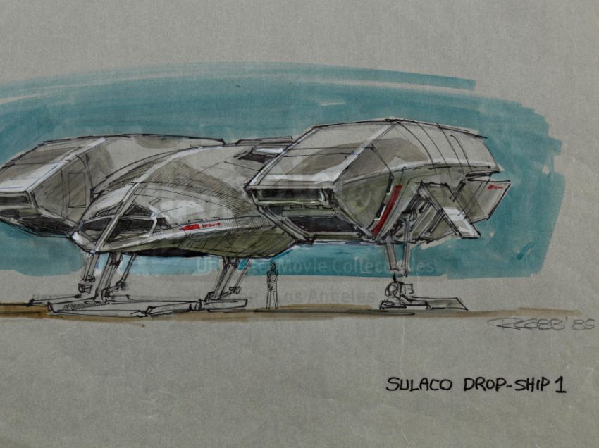 This hand-drawn concept sketch of the Dropship in its landing position is the work of the film's conceptual designer, Ron Cobb. It is rendered in marker, ink, and pencil on heavyweight drawing paper labelled "ALIENS SULACO DROP-SHIP 1" and signed "RCOBB €˜85". The sketch exhibits several tears along its edges and corners, as well as peeling between the layers of the paper itself. Dimensions: 37 cm x 43.25 cm (14 1/2" x 17")