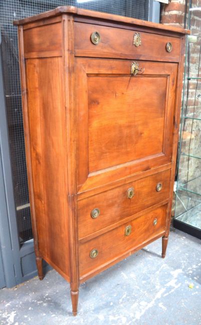 Vitrine à deux corps Höhe: ca. 263 cm. Breite: 145 cm. Tiefe: 60 cm. Nordfrankreich, 19. Jahrhundert. In Nussbaum gearbeiteter Unterkorpus mit pseudobarocker Schnitzreliefarbeit. Zwei Mitteltüren mit darüberliegendem Schubfach mit zwei Griffen, seitlich jeweils begleitet von einer Schwingtür und einem Schubfach. Aufsatz als zweitürige Vitrine mit bekrönendem Rocaillegiebel und Louis XVI-Ranken in plastischer google.com