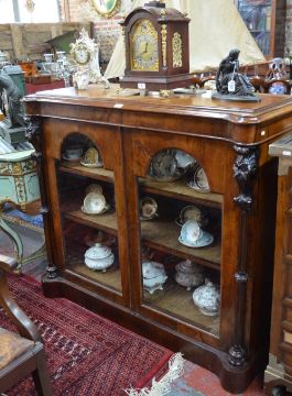 Vitrine à deux corps Höhe: ca. 263 cm. Breite: 145 cm. Tiefe: 60 cm. Nordfrankreich, 19. Jahrhundert. In Nussbaum gearbeiteter Unterkorpus mit pseudobarocker Schnitzreliefarbeit. Zwei Mitteltüren mit darüberliegendem Schubfach mit zwei Griffen, seitlich jeweils begleitet von einer Schwingtür und einem Schubfach. Aufsatz als zweitürige Vitrine mit bekrönendem Rocaillegiebel und Louis XVI-Ranken in plastischer google.com