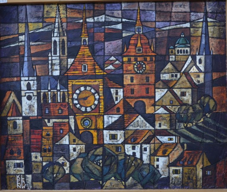 ussbaum gearbeiteter Unterkorpus mit pseudobarocker Schnitzreliefarbeit. Zwei Mitteltüren mit darüberliegendem Schubfach mit zwei Griffen, seitlich jeweils begleitet von einer Schwingtür und einem Schubfach. Aufsatz als zweitürige Vitrine mit bekrönendem Rocaillegiebel und Louis XVI-Ranken in plastischer Schnitzarbeit. Rest. (1221236) (1)