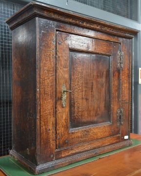 ussbaum gearbeiteter Unterkorpus mit pseudobarocker Schnitzreliefarbeit. Zwei Mitteltüren mit darüberliegendem Schubfach mit zwei Griffen, seitlich jeweils begleitet von einer Schwingtür und einem Schubfach. Aufsatz als zweitürige Vitrine mit bekrönendem Rocaillegiebel und Louis XVI-Ranken in plastischer Schnitzarbeit. Rest. (1221236) (1)