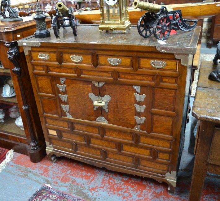 ussbaum gearbeiteter Unterkorpus mit pseudobarocker Schnitzreliefarbeit. Zwei Mitteltüren mit darüberliegendem Schubfach mit zwei Griffen, seitlich jeweils begleitet von einer Schwingtür und einem Schubfach. Aufsatz als zweitürige Vitrine mit bekrönendem Rocaillegiebel und Louis XVI-Ranken in plastischer Schnitzarbeit. Rest. (1221236) (1)
