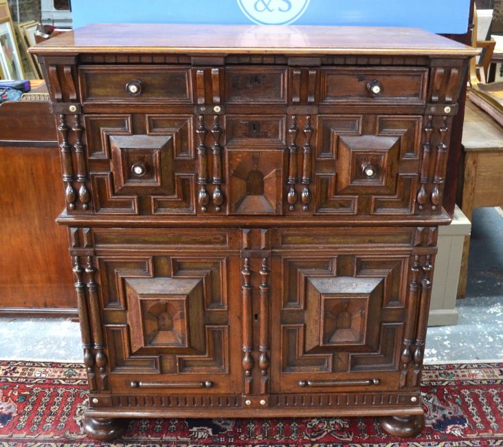 ussbaum gearbeiteter Unterkorpus mit pseudobarocker Schnitzreliefarbeit. Zwei Mitteltüren mit darüberliegendem Schubfach mit zwei Griffen, seitlich jeweils begleitet von einer Schwingtür und einem Schubfach. Aufsatz als zweitürige Vitrine mit bekrönendem Rocaillegiebel und Louis XVI-Ranken in plastischer Schnitzarbeit. Rest. (1221236) (1)