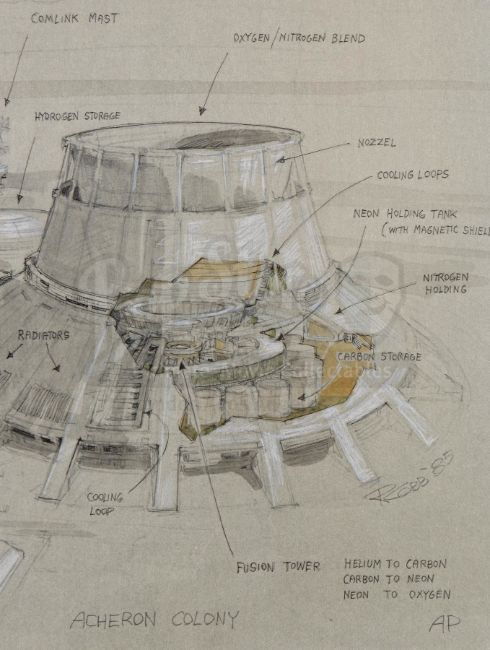 This hand-drawn concept sketch depicts an exterior view of the Hadley's Hope colony on LV-426, and is the work of the film's conceptual designer, Ron Cobb. It is rendered in mixed media on self-adhesive drawing paper labelled "ALIENS ACHERON COLONY AP" and signed "RCOBB '85". There is minor wear along the edges from handling, and the sketch is presented loose. Dimensions: 35.75 cm x 43.25 cm (14" x 17")