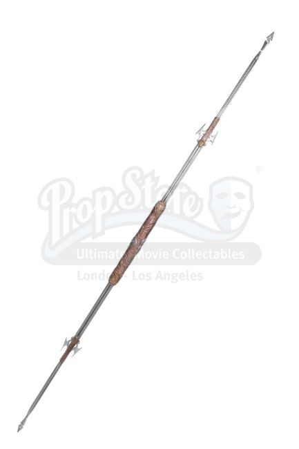 This full-size double-pronged spear-like weapon, designed by Academy Award-winning special effects group Amalgamated Dynamics, Inc. (ADI), is made of dense resin moulded around a steel pipe, hand-painted silver, copper, gold, and grey. A handle is set into the resin with a cerulean extending button at its centre. The handle and two ornate wings are engraved with otherworldly markings that hark back to the combistick designs first seen in Stephen Hopkins' Predator 2. The combistick has faux grime applied by the production to look distressed, and exhibits minor signs of wear including paint chipping. Dimensions: 213.5 cm x 6.5 cm x 10.25 cm (84" x 21/2" x 4")