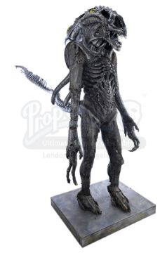 This full-size alien creature display, with all original components designed by Academy Award-winning special effects group Amalgamated Dynamics, Inc. (ADI), consists of a foam-latex domed headpiece hand-painted black and grey, and a matching foam-latex bodysuit. The bodysuit features armatured arms, a nylon lining secured with a zip closure, resin fingernails, snap-button joints on the arm and leg pieces, four dorsal tubes molded around exposed copper wire, and a long screw-on airbrushed latex tail moulded around a flexible metal-pipe core.