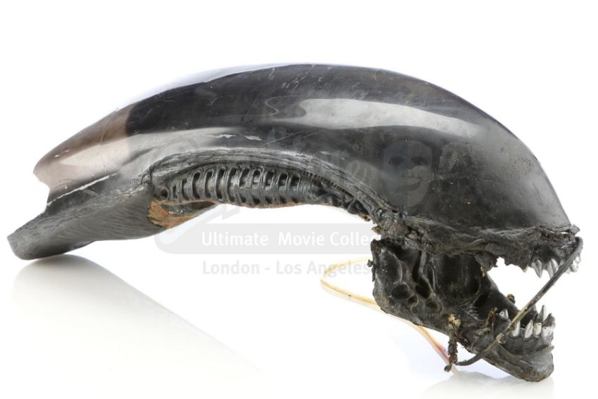 While its biomechanical details and iconic shape hark back to H.R. Giger's original creature design from Ridley Scott's Alien, this head exhibits a smooth dome that is unique to AVP. It is fragile from use and age, with piping exposed from multiple fractures throughout the fibreglass. Dimensions: 89 cm x 20.5 cm x 35.75 cm (35" x 8" x 14")