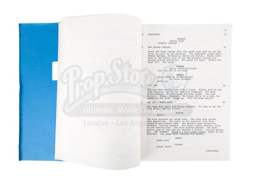 Credited to director James Cameron, the script is labelled as "Final Draft September 1985" and is bound within a blue card cover which features "100" written in silver on the top-right corner. The script comprises 106 unannotated pages printed on white US Letter paper.