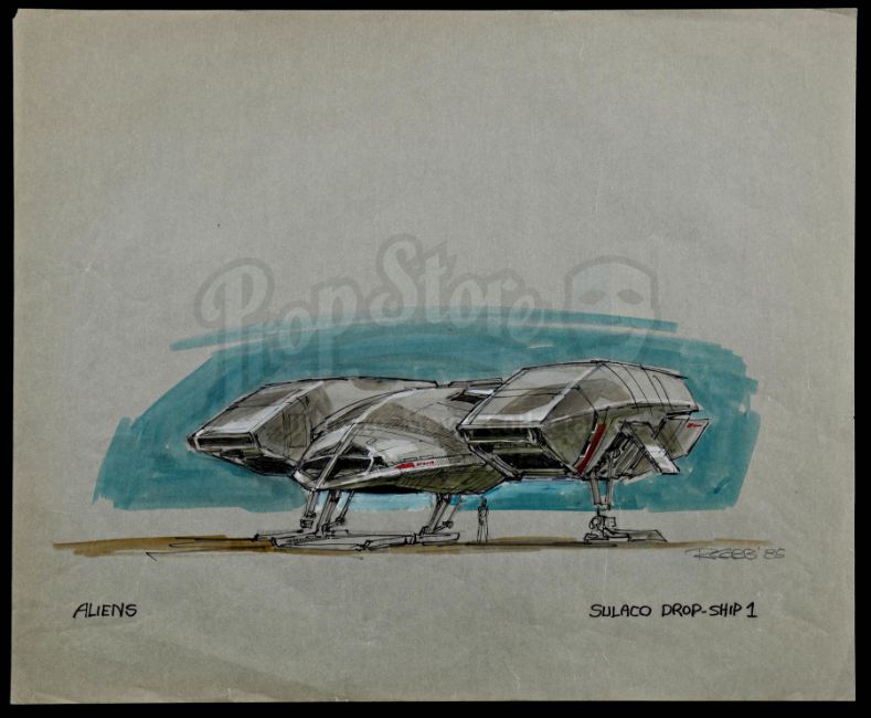 This hand-drawn concept sketch of the Dropship in its landing position is the work of the film's conceptual designer, Ron Cobb. It is rendered in marker, ink, and pencil on heavyweight drawing paper labelled "ALIENS SULACO DROP-SHIP 1" and signed "RCOBB €˜85". The sketch exhibits several tears along its edges and corners, as well as peeling between the layers of the paper itself. Dimensions: 37 cm x 43.25 cm (14 1/2" x 17")