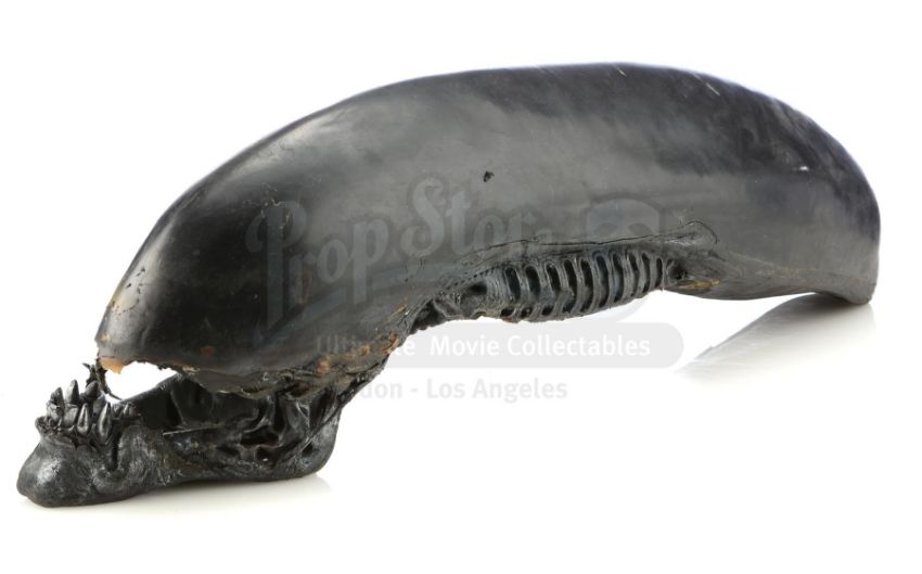 This xenomorph head with its signature elongated dome was designed by Academy Award-winning special effects group Amalgamated Dynamics, Inc. (ADI), is made of rubber airbrushed black and silver, and lacquered to appear slimy. While its biomechanical details and iconic shape hark back to H.R. Giger's original creature design from Ridley Scott's Alien, this head features a smooth dome unique to AVP. It is missing its upper teeth and exhibits various signs of use and wear to the rubber throughout. Dimensions: 90.25 cm x 23 cm x 29.5 cm (35 1/2" x 9" x 11 1/2")
