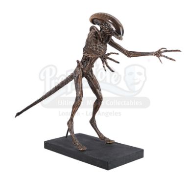 An alien creature maquette from the production of David Fincher's sci-fi horror sequel Alien3. After the events of Aliens, Ripley (Sigourney Weaver) was the sole survivor of the Sulaco, crash-landing on a prison planet. When she discovered that a xenomorph egg survived the crash and a new creature had been born, Ripley joined forces with the convicts to destroy the species once and for all. Maquettes were used as a visual aid during the development of the look of the new xenomorph. This was an important part of the pre-production process, as prior incarnations of the xenomorph had been gestated in humans. In Alien3, the xenomorph gestates in an animal ۠initially a cow, but this was changed to a dog in the final cut. To make the creature more animalistic, it was designed to be quadrupedal when running, although it could stand bipedally. The maquette was designed by Academy Award-winners Alec Gillis and Tom Woodruff, as well as Chris Halls (now Cunningham), and was inspired by H.R. Giger's original design. This particular maquette was the master copy; the first one out of the mould. Halls sculpted the model and it was hand-painted by Gino Acevedo, an FX industry veteran, renowned for his painting techniques. His name is signed and dated at the bottom of one of the feet. Once completed, the maquette was sent to Boss Films to be used as a paint guide for their "Go-Motion" puppet. Woodruff appeared in the film in the xenomorph suit for all close-ups and wide shots. The maquette is made of resin, features a translucent skull, and there are two small cavities on the bottom of the shoulder blades which were caused by air pockets during the first casting. The tail is a seperate piece and was also a paint-reference master. It attaches to the main body to complete the creature's iconic look. The maquette is displayed on a wooden stand with a metal rod for support. There is some wear from age and production use. The tip of the tail has broken off and there are small areas where the paint has worn away. Dimensions: 75 cm x 50 cm x 137 cm (29 1/2" x 19 3/4" x 54")£10000-15000 Ω