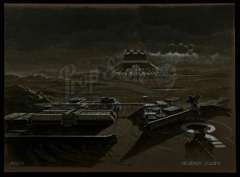 This hand-painted concept art depicts the atmosphere-generating plant and the rest of the Hadley's Hope colony established on LV-426. It is the work of the film's conceptual designer Ron Cobb, and rendered in mixed media on illustration board labelled "ALIENS ACHERON COLONY". The board exhibits tears and stains on its back and corners. Dimensions: 52 cm x 70 cm (20 1/2" x 27 1/2")