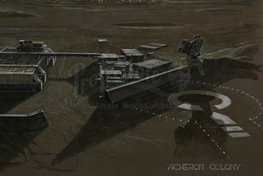This hand-painted concept art depicts the atmosphere-generating plant and the rest of the Hadley's Hope colony established on LV-426. It is the work of the film's conceptual designer Ron Cobb, and rendered in mixed media on illustration board labelled "ALIENS ACHERON COLONY". The board exhibits tears and stains on its back and corners. Dimensions: 52 cm x 70 cm (20 1/2" x 27 1/2")