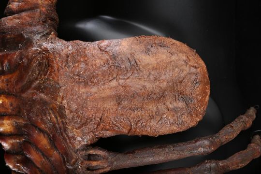 The facehugger skin is made of latex and features realistic detailing, including veins, wrinkles and ligaments. The flexible tail is made of foam latex to enable it to wrap around the victim's neck. A monofilament wire protrudes from the end of the tail and fingers, which would have been pulled to give the impression of the facehugger tightening its grip. The legs feature articulated wire cores attached to the skeleton. Latex sacks on either side have an egg-shaped weight within to ensure they hung correctly over Kane's face. On the underside of the facehugger, the metal skeleton is exposed.