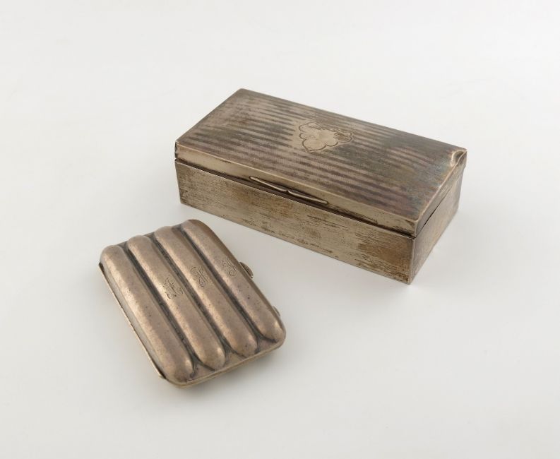 A silver cigar case, by Charles Green and Co, Birmingham 1918, rectangular form, modelled to fit four cigars, length 13cm, plus a silver cigarette box with engine-turned decoration, Birmingham 1932, approx. weighable 5.5oz. (2)
